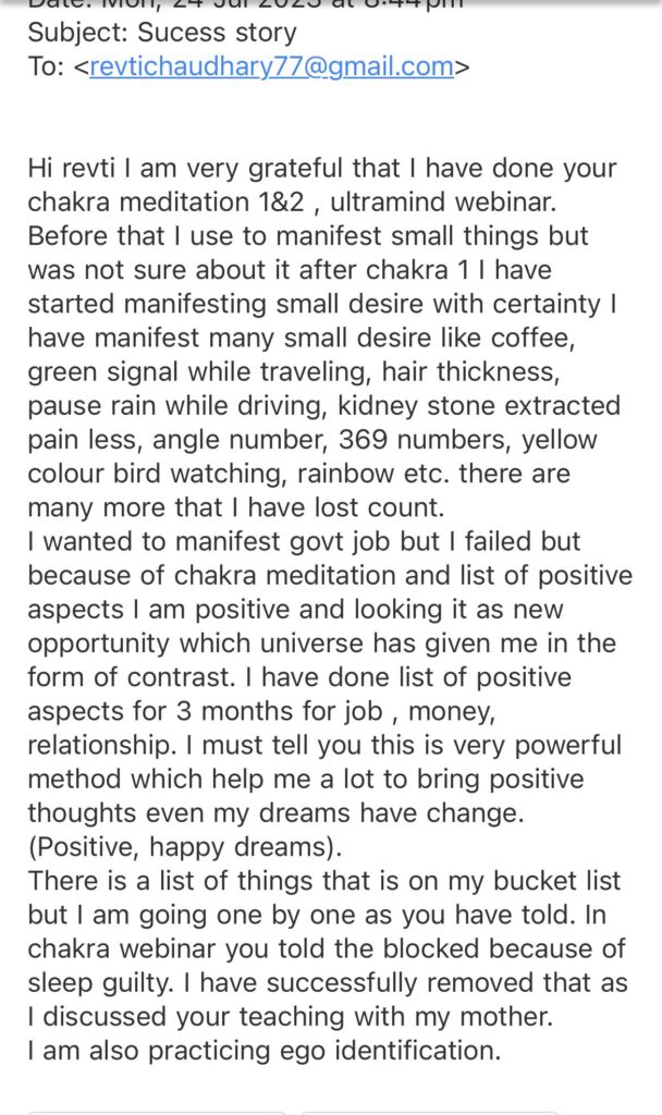 Before joining Chakra Meditation Level 1 & 2 and the Ultramind Webinar with Revti, I had casually manifested little things: a coffee here, an angel number there. But I wasn’t certain if it was real or just luck.