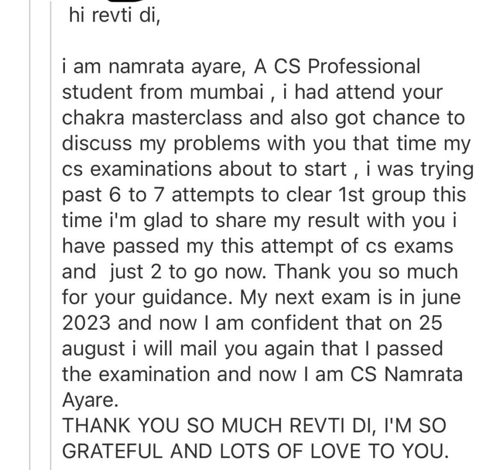 Not only did she attend the session, but she also got the opportunity to speak directly with Revti and seek guidance. With renewed energy, mindset, and emotional clarity, Namrata went back to her studies. This time with a new inner strength.